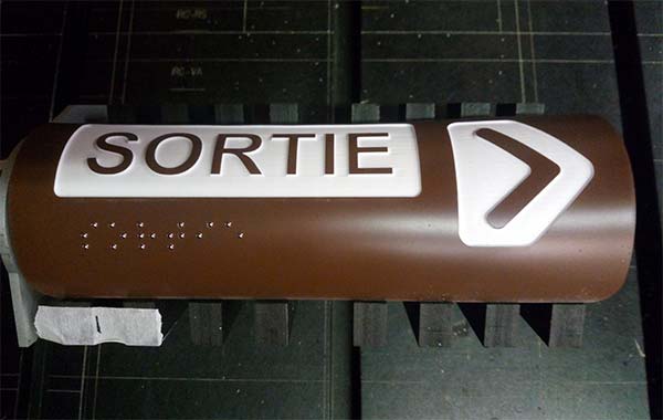 Le plus souvent réalisés en matériaux synthétiques plastiques gravés et découpés au laser. Ceux-ci concernent les numéros d’étage, le repérage des portes, les plans d’évacuation des bâtiments.